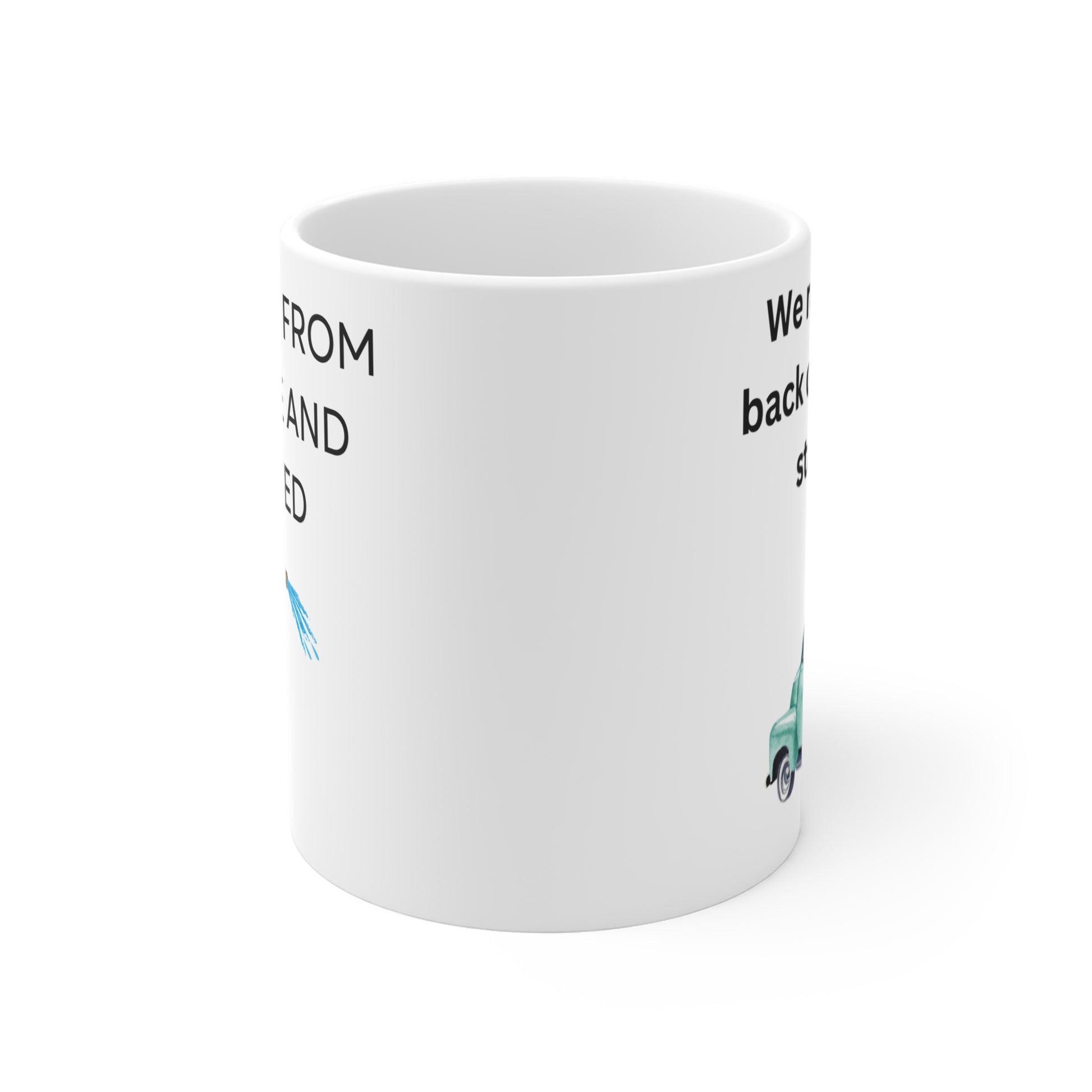 This 11oz white ceramic mug brings a little roadside nostalgia to your morning coffee. A soft watercolor pickup truck and the playful line “We rode in the back of pickups... standing.” evoke sun-warmed summers, gravel roads, and childhood freedom. It feels like a small moment of memory you can hold — steady in your hand and easy to care for. The rounded edges and classic C-handle make it comfortable to sip from, while the durable ceramic finish stands up to daily use in the kitchen. Use it at the breakfast table, on the workbench, or beside a stack of well-loved photo albums to relive simple, loud afternoons.